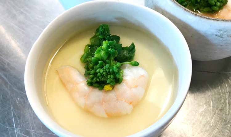 5 蒸しあがった茶わん蒸しの上に3のあんをかけ、海老と菜の花を添える。
