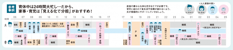 毎日の家事・育児を夫婦でシェアしたり、夫が積極的に関わったりするために、まずは「見える化」することが大事! 実際に表を作ってみると予想以上に24時間、大忙しです。